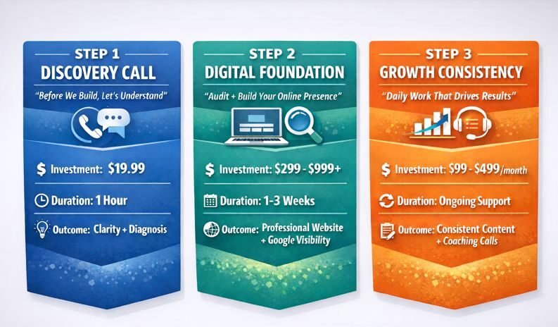 Perfect! The Discovery Call includes an audit of your existing presence. We’ll identify what’s working, what’s not, and what needs improvement. Step 2 can focus on redesign/optimization rather than building from scratch.
